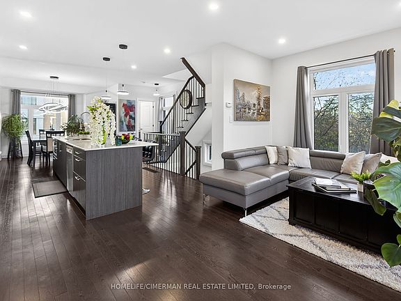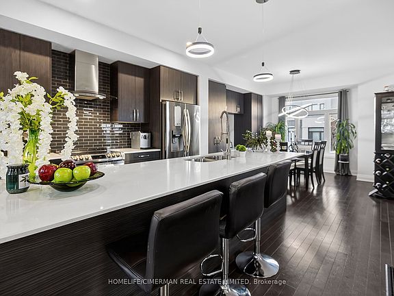 Large centre islandCustom cabinetryStainless steel appliancesUpgraded hardwood floorsSmooth ceilingsModern lightingCorner semi