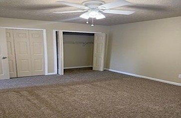 - Bedroom with ceiling fan and plush stainmaster carpeting