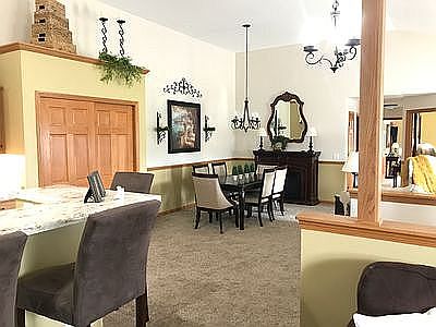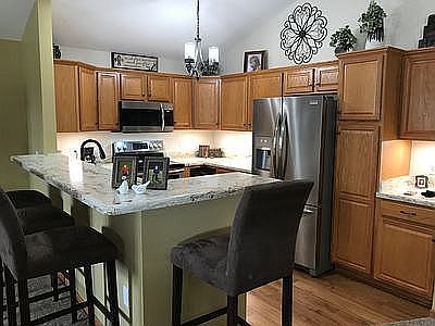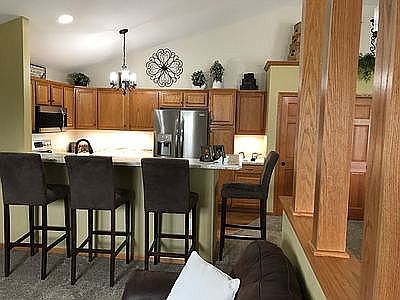 Newly remodeled Upper 2 bedroom, 2 bath condo with vaulted great room with gas fireplace, in-unit laundry. Master suite with walk-in closet and private bath. Raised panel oak cabinetry with crown molding in kitchen. 2 car attached garage two remotes.New countertops new stainless steel kitchen sink new faucet and new cabinet hardware. Bathrooms have new vanity tops new toilets and new Faucets. New floors in front foyer kitchen and both bathrooms. Chair rails in dining area living room and hallway, New door hardware , And updated plug-ins and paddle switches. Condo completely repainted ceilings and walls. New Oil bronze lighting throughout condo. New ceiling fans in den and both bedrooms. All draperies included and four extra height barstools .Completely move-in condition.