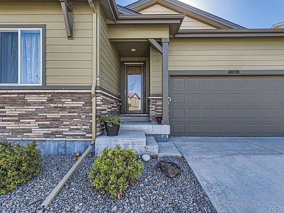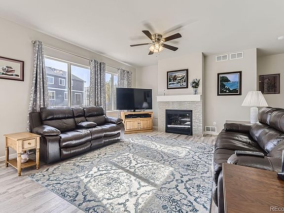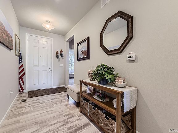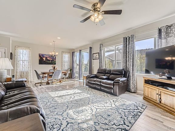 This practical ranch style home has an open concept floor plan featuring a great room... with gas fireplace, ceiling fan and window treatments... that flows freely from the kitchen.. with island, Whirlpool Stainless Steel appliances and pendant lights. The spacious Primary Bedroom and Five Piece Bath are on the main level along with the Two Guest Bedrooms, adjoining Full Bath and Laundry Room. The full unfinished basement with 9’ walls offers plenty of extra space for future build-out. The cozy backyard off the concrete patio has astroturf while the large east side yard has stone for easy maintenance and water conservation. Community is near one of Parker’s largest public parks expansions and only minutes from the charming and historic downtown Parker area with its many shops and restaurants.