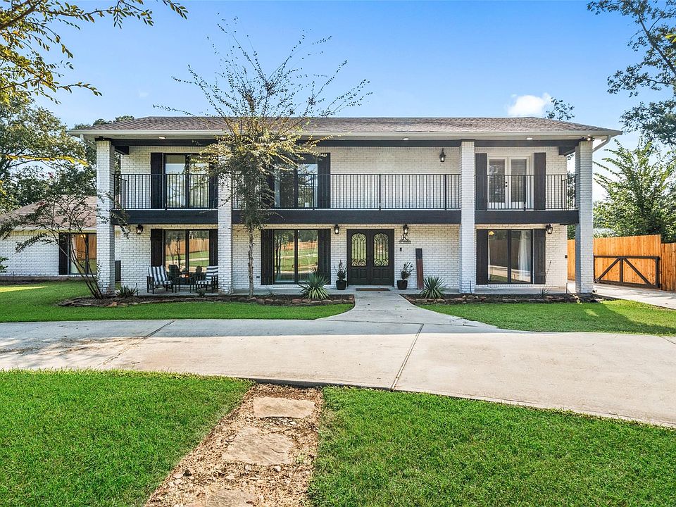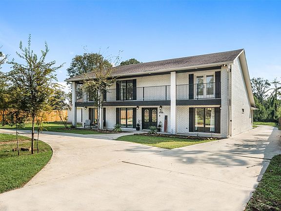 Gorgeous white brick home with 5,000+ sqft of living space, 6 beds/4 bath on 17.91 unrestricted acres with gated entrance and privacy fence. Inviting front porch with double doors, opening to entry, sitting room and dining room. Island kitchen offers abundant storage, brick accent wall, breakfast bar, walk-in pantry with sliding barn door, corner sink with window and breakfast nook, all flowing into the living room with vaulted ceilings, exposed beams & floor-to-ceiling stone fireplace. Downstairs includes two primary suites with full baths, an add'l bedroom and bath and media room, while upstairs offers 3 oversized bedrooms—2 with balcony access—sharing full bath. Utility room provides extra cabinetry, countertop space and sink. Outside, concrete driveway with circle drive, attached carport, covered patio with outdoor fireplace & kitchen, 1800 sqft workshop with 3 bay doors and 15+ acres behind is perfect for horses, barn or other possibilities, make this property an exceptional find.