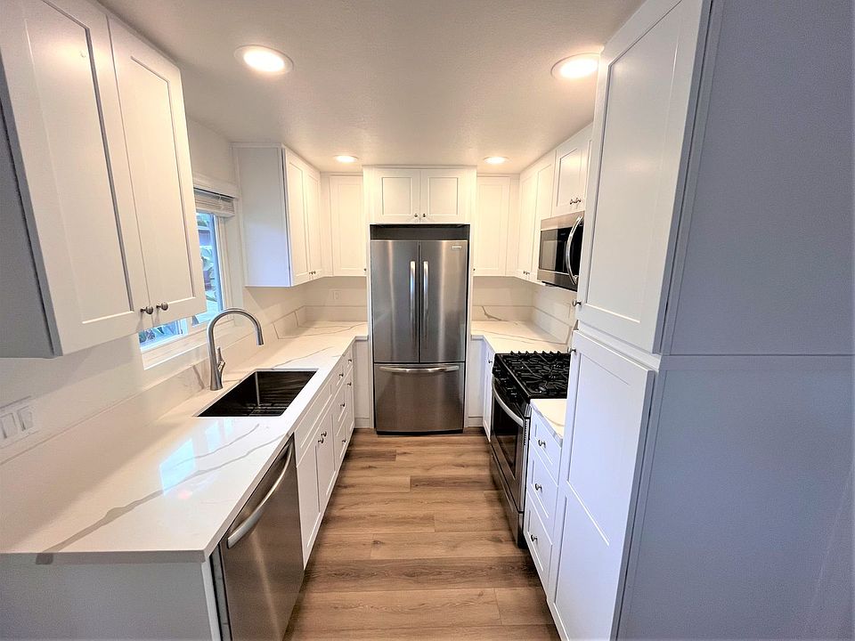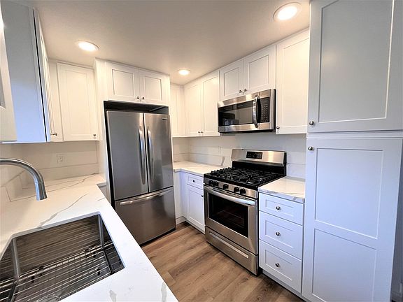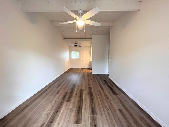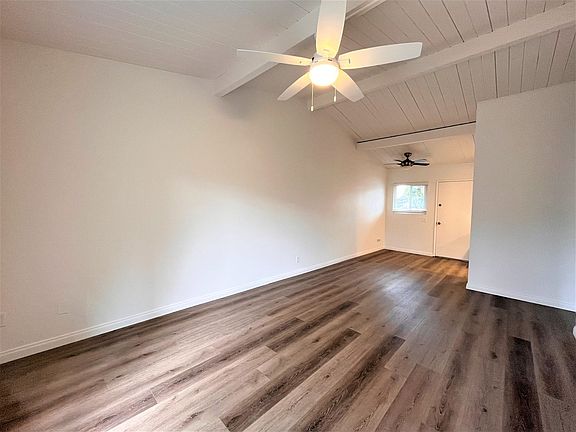 Remodeled in 2022 with quartz counters, new cabinets, stainless steel appliances, recessed lighting, custom tile shower and more!! Faux wood floors throughout. Vaulted ceilings and private fenced patio with outdoor shower. Community laundry and off street parking. Small storage closet included.