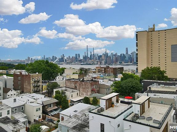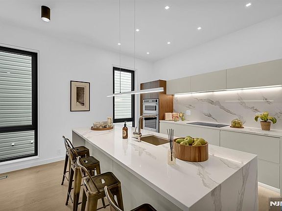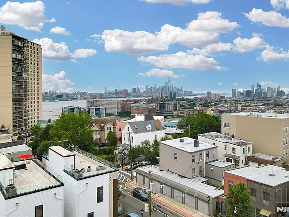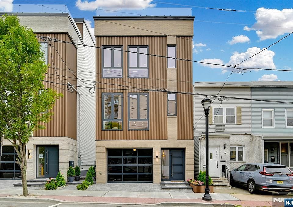 Welcome to the "Cliff Haus" at 1803 Cliff Street! Perched high above the cliffs overlooking Hoboken and Weehawken, this ground up single-family new construction home is above all: a high-end design/build on three levels plus a roof deck with amazing views of New York City, the Hudson River and Hoboken. Features include: 2,811 total square feet home on 3 floors, 750 sq.ft. roof deck with amazing views of New York City, the Hudson River, and Hoboken; 450 sq.ft. private, fenced in backyard; 2-car garage with glossy epoxy flooring; 9 inch ultra-wide hardwood flooring in White Oak (86" long planks); European tilt & turn windows in uPVC, double glazed; Window & garage door frames in trendy 'anthracite gray' color (RAL 7016); 10 ft. tall ceiling height on living/dining & kitchen level; 8 ft. tall windows; Oversized, solid interior doors; Custom wardrobes and walk-in closets with LED lighting; Imported porcelain tiles in all bathrooms, complented by Kohler & Grohe fixtures; European-style curbless walk-in shower in windowed primary bathroom; Custom kitchen, two-tone (cream and walnut) with paneled refrigerator and paneled dishwasher. High end quartz countertops with waterfall sides and full quartz backsplash 9" inch ultra wide hardwood flooring in White Oak; Bosch dishwasher; Bosch induction cooktop; KitchenAid wall oven /microwave combo; Thor paneled & built-in refrigerator; Kraus workstation kitchen sink; Roof deck with porcelain pavers and frameless glass railing; 2 HVAC systems &