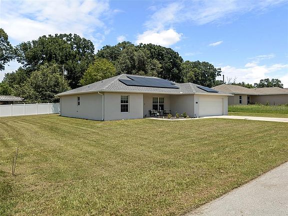 Better Than New & Loaded with Features! Welcome to this beautiful 3-bedroom, 2-bath home tucked away on a peaceful dead-end street in Citra. Built just 3 years ago, this home is move-in ready and better than new—with energy-efficient solar panels to keep your electric bills low all year long! You'll love the spacious, open floor plan with a large kitchen featuring granite countertops, tons of cabinet space, and a huge bar perfect for entertaining. Both bathrooms also include granite finishes for a sleek, modern feel. This smart home comes fully equipped with a Ring doorbell, indoor camera, and window alarms monitored by ADT for added peace of mind. Low-maintenance and located in a quiet neighborhood, this home offers comfort, security, and style in one perfect package. Home qualifies for USDA 100% financing!!!