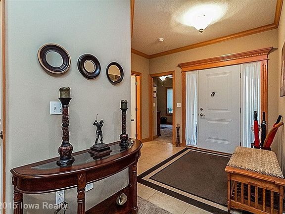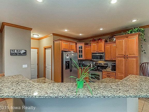 Beautiful ranch townhome resale. Crown molding graces the main floor great room, kitchen, and entry. Gas fireplace with lovely trim and molding as well as wainscoting below the windows. The kitchen boasts upgraded maple cabinets, granite countertops, breakfast bar, and tile floors. Main floor laundry room. Master suite includes door to deck, jetted tub, double sinks, and walk in closet. Main floor also has 2nd bedroom and another full bath. Lower level is finished with a stone fireplace in the huge family room, 3rd bedroom and 3rd bath. End unit with lots of green space and view of the Ankeny Sports Complex. Great location!
