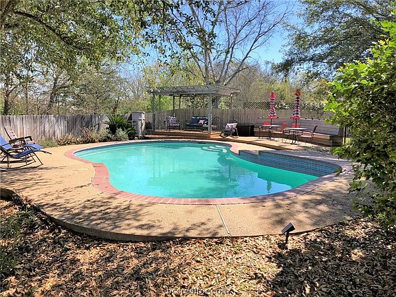 Meticulously maintained, 4 bed 2 bath home with in-ground swimming pool minutes from TAMU in a quiet cul-de-sac. Good bones updates include a roof and water heater both installed in 2020. Cosmetic updates include wood look tile, leathered granite counters, and updated lighting fixtures. Spacious pool area features pergola and plenty of lounging room to escape from the Texas Heat this summer! Pool is fenced separately which leaves a good-sized yard for kids, hobbies, or furry friends. Inside you'll find a split floor plan with 4 bedrooms, 2 baths, and a 2nd living area or study nook connected to the master. Large living room boasting towering ceilings anchored by a brick fireplace (gas) & mantle. Huge laundry room with sink, counter, desk area & lots of cabinets. Every room has crown molding & celling fans. Home is leased for $2350 a month through 6/30/2023. Prior day notice for showings is required. OFFER DEADLINE MONDAY AT 10:00 AM