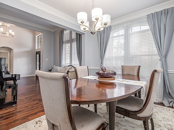 This gorgeous David Weekley home boasts a striking brick and stone elevation and a front-facing three-car garage. Inside, you're welcomed by soaring ceilings and an impressive floor plan designed for both elegance and comfort. Off the grand entryway, you'll find a stacked formal dining area with a statement chandelier and an inviting living room—perfect for entertaining guests. Rich hardwood floors and a neutral color palette enhance the home’s timeless appeal. The gourmet kitchen is a chef’s dream, featuring a central island with gas cooktop, granite countertops, stainless steel appliances, a raised breakfast bar, and a stylish tile backsplash. A sunny breakfast nook with bay windows offers charming views of the spacious backyard. The main living area is anchored by a cozy fireplace flanked by double windows, creating a warm and inviting space. Retreat to the expansive primary suite with a sitting area framed by bay windows. The luxurious en-suite bath includes a garden tub, separate shower, dual sinks, and a generous walk-in closet. A private guest suite on the first floor makes a perfect home office or secluded space for visitors. Upstairs, two additional bedrooms are connected by a Jack-and-Jill bathroom, plus a split third bedroom up! Multiple staircases lead to an oversized game room complete with a built-in desk—ideal for a study station or creative space. French doors open to a massive media room, perfect for movie nights. Step outside to a large covered patio overlooking an oversized backyard—perfect for relaxing or entertaining all year round and with ample space for a future pool!