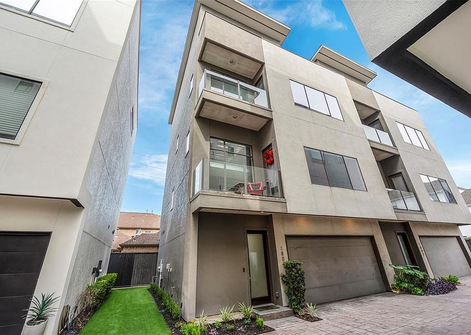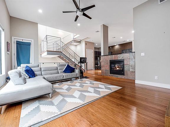 Fabulous 3-4 bed, 3 full and 2 half bath townhome with 4 story soaring floating staircase. Elevator ready. Huge picture windows offer an abundance of natural light. Open plan living with double sided gas fireplace separating living and dining spaces. Balconies on floors 2 and 3 with a roof terrace on top. Primary suite includes double vanity, frameless shower, jetted tub and custom closet. 4th floor has bed/flex/media room with half bath. Wet bar with generous counters and cabinets sit just inside the roof terrace with skyline view. (2) 16 SEER A/C units, tankless water heater and 2022 roof. Amazing home in an amazing location !