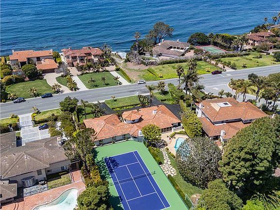 Welcome to this exquisite ocean-view tennis court estate in the prestigious Lunada Bay neighborhood of Palos Verdes Estates. Step indoors to discover thoughtfully updated designer touches throughout. The formal living room invites entertaining, while the cozy family room provides a comfortable retreat. The dining area is perfect for hosting grand dinners or intimate gatherings. The modern kitchen boasts a chic eat-in area, perfect for casual dining. The serene primary suite features an ensuite bathroom, and there are three additional bedrooms. An adaptable office space can easily transform into a fifth bedroom. Ascend to the ocean-view tower room upstairs—a unique retreat within the residence. Outside, the grounds beckon with resort-style amenities, including expansive patio and lawn areas for ultimate relaxation. Enjoy a refreshing swim in the sparkling pool, unwind in the bubbling spa, or engage in friendly competition on your private tennis court. Additional amenities include a circular driveway, gated front courtyard entry, and an attached three-car garage with an EV charger. Its prime location affords easy access to top-rated schools, Lunada Bay Plaza, and a variety of hiking trails – perfect for those seeking a prestigious coastal lifestyle. For a private viewing, please call or text.