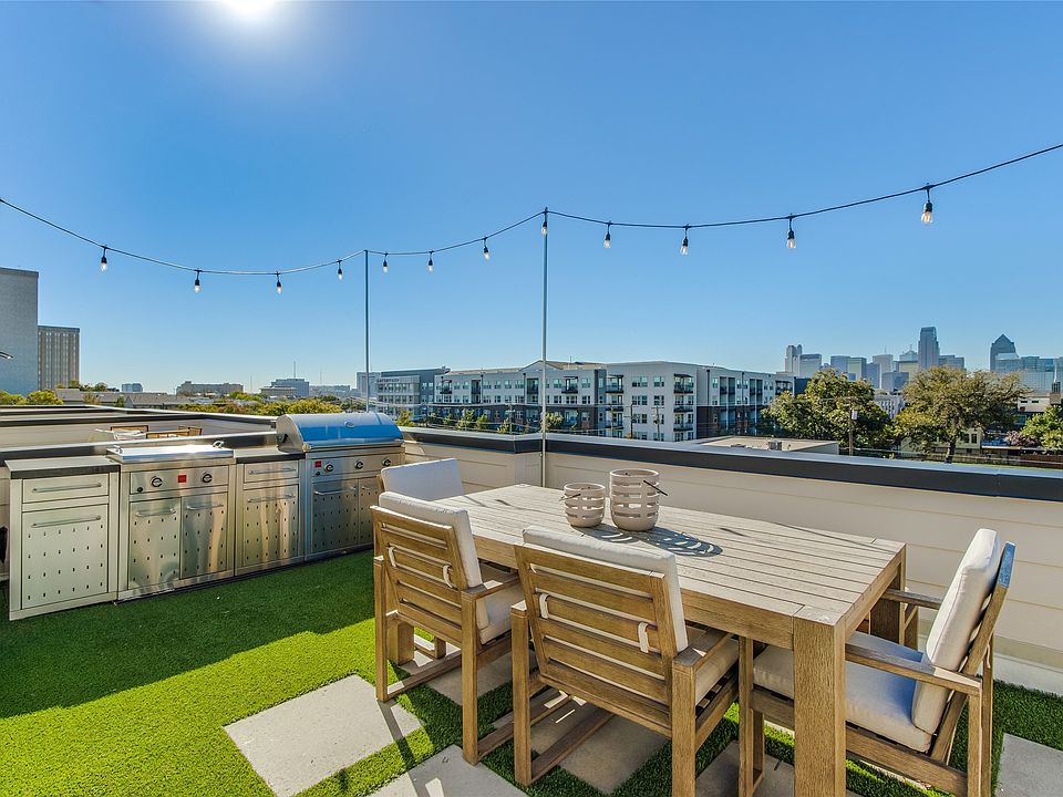 BETTER THAN NEW! Discover upscale urban living in this stunning contemporary condo, built in 2021 and loaded with luxurious features and recent upgrades. Spanning three levels with 1,750 square feet of meticulously designed space, this 2-bedroom, 2.5-bath home offers an open layout filled with modern amenities. The heart of the home is the gourmet kitchen, equipped with a farm sink, island, natural stone countertops, upgraded lighting, and premium appliances. Rooftop oasis, complete with a dining set, turf with stepping stones, high-end grill, sectional sofa, and mounted TV. All rooftop furnishings convey with the home, providing a turnkey entertainment retreat in the heart of the city. Each bedroom boasts ensuite baths with high-end finishes, while electric shades throughout the home offer comfort and privacy. Additional recent upgrades include new lighting in the kitchen, dining, and bedrooms, upgraded kitchen hardware, epoxy garage flooring, and built-in garage storage. The property is equipped with a 2-car attached garage with direct access and is part of an HOA that covers sewer, trash, blanket insurance, landscape maintenance, and pest control for added ease. Located within Dallas ISD and managed by Mustang Property Management, this townhome is a rare find—offering refined, low-maintenance living with every modern convenience in place.