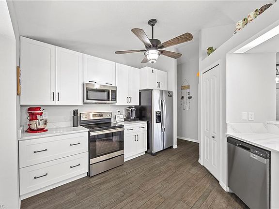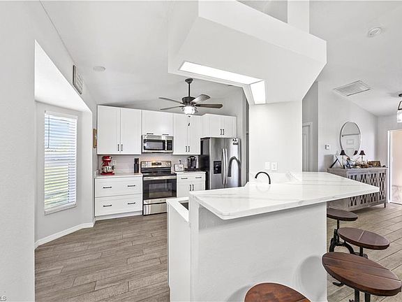 Presenting this beautiful home in Southwest Cape Coral, featuring three bedrooms, two bathrooms, and a two-car garage. This tastefully updated residence offers ample space for a pool and includes several recent upgrades. Key features include: * **Newer Roof (2021)** * **Remodeled Kitchen:** Boasts stainless steel appliances, 42" shaker-style cabinets, spectacularly spacious quartz counters, a pantry, a breakfast nook, and a counter bar that opens to the living area. * **Newer A/C System** * **Newer Ceramic Tile Flooring:** Flows seamlessly throughout the home and lanai. * **Remodeled Bathrooms** * **Outdoor Living:** A dining area that opens through French doors to an under-truss, screened lanai and an oversized screened patio. * **Master Suite:** Features a tray ceiling and pocket doors leading to a master bath with dual sinks, a private shower, and a commode. * **Additional Amenities:** Interior laundry room, screened front entry, and tropical landscaping. The home also includes an appliance warranty for added peace of mind