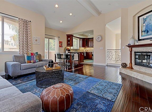 This warm and inviting front unit townhome will wow you from the moment you enter. Beautiful solid wood front door leads you into a formal entry with tall ceilings and iron rail staircase. The entry level features two bedrooms, one bathroom and convenient access to the pristine 2-car garage. The upper level is extremely spacious, with vaulted cathedral ceilings, crown moulding and open concept floorplan- perfect for entertaining, or watching the kids while preparing dinner. Gourmet kitchen outfitted with stainless steel appliances, brazilian granite countertops and tons of storage! Dark walnut engineered hardwood throughout the main living area provides a beautiful contrast to the bright paint palette throughout. Upper level also includes a huge master suite w/ vaulted ceilings, walk-in closet and ensuite bath w/ double sinks, separate shower and huge soaking tub. The home also features an intercom system, new A/C unit, wiring for surround sound in living area as well as professionally landscaped drought tolerant front yard. Amazing schools, convenient freeway access and close proximity to parks, restaurants and shopping- this townhome has it all!