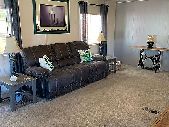 MUST SEE! 14’ x 64’ Renovated in 2018 with Living room expansion; New: laminate wood floors, carpets, paint, countertops, sinks, light fixtures/ceiling fans, drapes, blinds and plantation shutters, walk-in shower with updated sliding barn door on bathroom. ALL furnishings in photos included....as well as all appliances, washer and dryer. Bedroom will accommodate a king size bed. Kitchen has a nice pantry. Very large living room and kitchen with gorgeous views of the mountains out the front window. New water heater and AC/Heat pump and plumbing replaced in 2018. Large front and back covered porches with HUGE fenced-in patio area(sun shades included). 2 small/medium size pets allowed. New storage shed addition built in 2020. Parking for 2 vehicles. Next to clubhouse, pool, jacuzzi and amenites. Located in the Sierra Leone MHP, 55+ with park approval. Small gated community; Lot rent of $490.00 includes partial water and trash. Taxes $183/year. Clubhouse has free WiFi and you are able to access it in the trailer. Views of the Superstitions, Goldfields and the Four Peaks mountains. (This is a 55+ community and you must have park approval prior to purchase). Managers are super nice! No hidden broker fees as this is for sale by owner. IF NO ANSWER, PLEASE LEAVE MESSAGE AND I WILL CALL YOU BACK. 715-661-1741. ****All photos are recent and the trailer has been cleaned, including carpets.