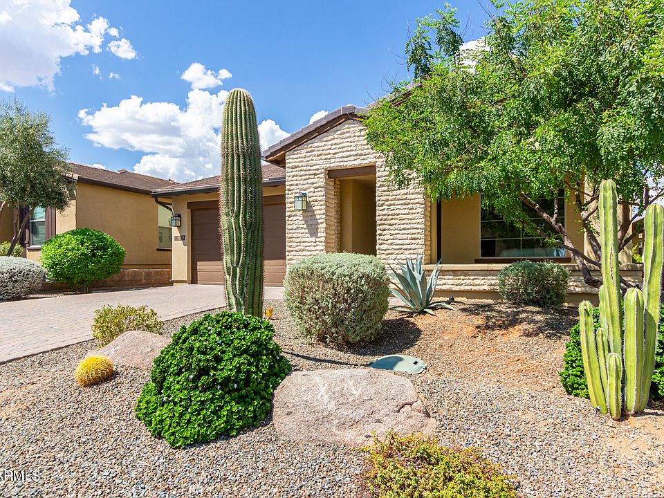 Gorgeous single level home with Great Room design, spacious Living Room, Dining, Breakfast Bar. Chef's kitchen w stainless steel appliances, walk-in pantry with a built-in desk corner. Gas range with hood, a wall oven, woodgrain tile, and a great room with a ceiling fan and motorized blinds. Primary Bedroom w King Bed, Guest room with queen. The primary suite boasts plush carpet, a tiled shower, a walk-in closet with added shelves, and a dual sink vanity with granite countertops. The large secondary bedroom is split from the primary suite. Step outside and enjoy the oversized backyard with a covered travertine patio, water misters and built-in BBQ station