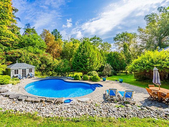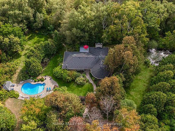 Absolute and ultimate piece of paradise on a prime 8 ACRE corner lot in the prestigious, soughtafter Finnerty Rd neighborhood. The grounds are truly gorgeous and a paradise forgardeners. A beautiful spring fed waterfall is like a photo of Giverny France from the living roomwindow. The surroundings are peaceful and ecologically luxurious with a quaint stone patio anda pond of colorful water lilies. The inground pool was built like a luxury resort oasis with all thebells and whistles. Two access points, one off Airport Road and the other off Finnerty S. Thepicturesque 8 acres offer several look outs onto perfectly managed grounds, a circular drivewayand a large clearing off Finnerty ideal for a large tent or added drive-shed. The huge elevateddeck has a clear view of the grounds and the waterfall. THE MAIN HOUSE is gorgeous with hardwood floors throughout. The living- dining great room has a high vaulted ceiling with beams and in mount lighting with wall-to-wall windows overing looking the waterfall and like a wall painting with this great view. The floor to ceiling stone,woodburning fireplace is the show piece. The kitchen is truly a French country kitchen withhandmade tile counter and molding and beautiful hand painted backsplash. The kitchenoverlooks yet another gathering room with conservatory wrap around windows and woodfloors with a walkout to the quaint piazza with café table and a brilliant view. This bungalowoffers spacious rooms with 2 bedrooms on the main floor and the basement has a family roomwith a walkout, huge laundry facility and another large bedroom & 3 pc bath, plus loads ofstorage space & a workshop.