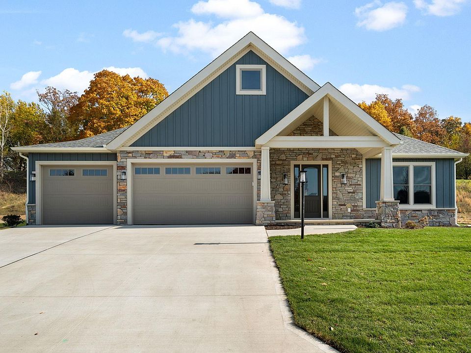 A newer development with proven appreciation, this Bradford Shores villa is centrally located between South Bend and Granger. Being less than five miles from Notre Dame provides access to dining, shopping, bike paths, easy access to the toll road, and highly rated schools. The main floor of this home hosts a master suite with custom ensuite bathroom and a spacious walk-in closet. With an eat-in kitchen island, walk-in pantry, and open dining room, this home is ready to entertain. Off the kitchen is the spacious great room with stone fireplace and built in bookshelves. The main floor is complete with an office and additional bath. The mud room with built in cubbies opens up to a large laundry room with storage. The finished lower level provides a two additional bedrooms, full bath, workout room and additional storage. The exterior includes an entertaining space with pation and seat wall as well as a covered porch with full stone gas fireplace. Fully landscaped with an automatic sprinkler system. This home is a must see!