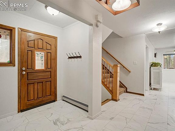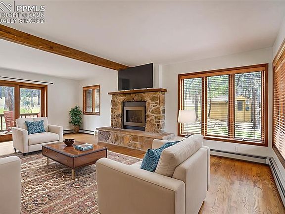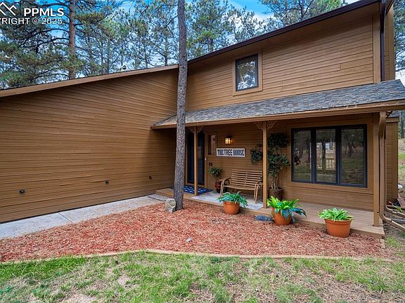 Set on nearly an acre in Walden III, this two-story home captures the quiet beauty of Black Forest living while keeping you close to the best of Monument & Northgate amenities. Easy access to Hwy 83, I-25, & District 38 schools makes daily life feel effortless, yet the treed setting offers complete privacy & peace. Inside, the layout flows naturally for both gathering & retreat. The main level opens w/ hardwood flooring, a natural wood entry, & tall ceilings bringing in light through skylights & tall windows. The living room blends warmth & character w/ a wood-burning stove framed by brick detail plus an additional gas fireplace for added comfort. The luxury remodeled kitchen combines style & practicality w/ stylish granite countertops, granite backsplash, & marble tile floors, anchored by an island & adjoining breakfast nook. The adjoining formal dining space connects easily to the kitchen & deck for outdoor dining or morning coffee surrounded by trees. The multiple outdoor spaces offer you plenty of opportunities to enjoy the wonderful setting. Upstairs, the primary suite feels like a private escape w/ a spa-style bath featuring a double walk-in shower & an impressive walk-in closet with tons of extra storage. Two more bedrooms & another full bath complete the upper level all offering views of the landscape. The finished basement adds flexibility w/ two additional bedrooms, a large family room w/ built-ins, & plenty of natural light. Three separate decks expand the living space outdoors, ideal for entertaining or relaxing in the included hot tub beneath the pines. The oversized 2-car garage sits even w/ the main level, offering storage, workspace, & easy access year-round. A rare combination of space, serenity, & convenience, just minutes to shopping, dining, & everyday essentials yet surrounded by the peaceful landscape of Black Forest. Experience the best of Black Forest living w/ modern updates, serene wooded views, & seamless access to city life.