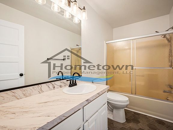 A hallway from the living room takes you to a master suite, two guest bedrooms, a guest bathroom, and a hallway linen closet. The master bedroom includes its own master bathroom and a large sliding double-door closet. Both guest bedrooms also come with sliding double-door closets. The guest bathroom is a full bathroom.