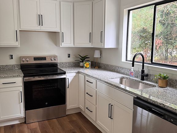 The kitchen has been completely gutted and rebuilt featuring all-new cabinetry, hardware, countertops, sink, faucet, and brand-new appliances. Every light fixture in the home is new, and both bathrooms have been refreshed with new vanities, lighting, and contemporary finishes.