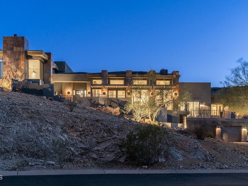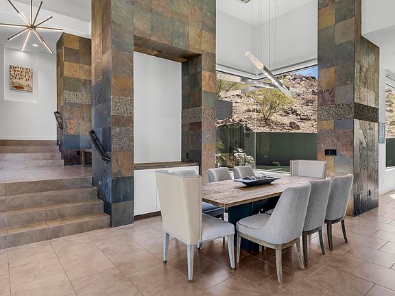 The soaring ceilings emphasize modern architectural features, complemented by a gas fireplace and slate accents. The space flows smoothly into the formal dining area, living room, gourmet kitchen, and features floor-to-ceiling windows offering stunning mountain views from every angle. Tall designer patio doors open to the main outdoor living space, including a wrap-around patio, an outdoor barbecue, and a heated pool. This area is ideal for entertaining while enjoying breathtaking views of the city lights, sunrises, sunsets, and South Mountain. The gourmet kitchen boasts granite countertops, stainless steel appliances, a breakfast bar, a spacious pantry with plenty of cabinets and counter space, and a bright, welcoming kitchen nook. The low-maintenance backyard features artificial turf and a stunning two-tier fountain, visible from the foyer.
