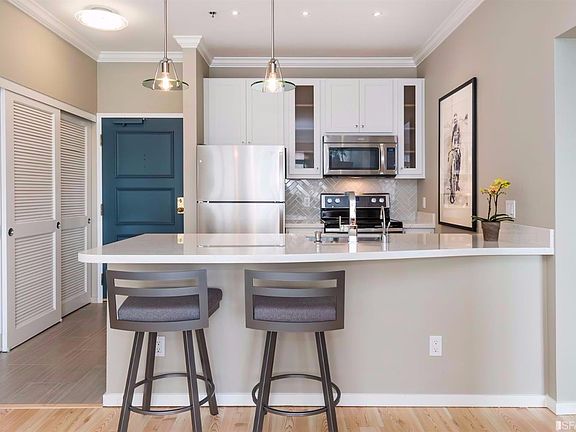 Elegantly upgraded two-story, townhouse style 2BD/2BA condominium. With 9'ceilings this top floor, OPEN PLAN corner unit has superb light, privacy. Romantic MBD suite with a wood burning fireplace, sauna. Exclusive use view deck. Upgrades include quartz counter tops, Edison light pendants, Italian honed tile, Moen fixtures, MBA with double sink. In the heart of the chic, vibrant Fillmore district, within an easy stroll are numerous eateries, some of them Michelin starred, movie theaters, music venues. Meet friends at a nearby watering hole, look for treasures in second hand shops, browse boutiques for the latest fashions, pick up fresh produce at the weekly farmer's market. The Fillmore, with its walk score score of 100, is a jewel