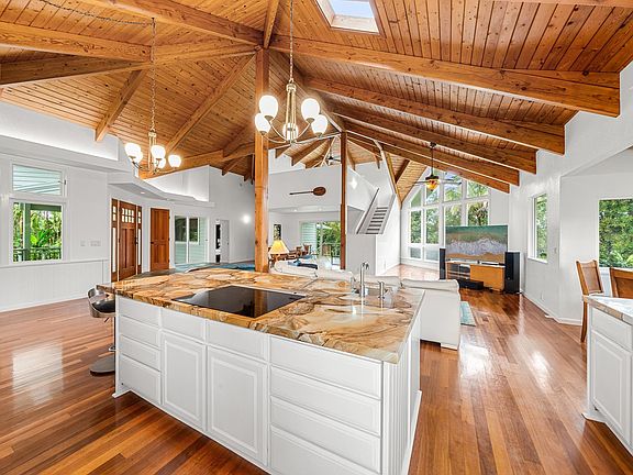 Architect, Ken L. Morin, perfectly captures contemporary Hawaiian style in this spacious and dramatic home located behind gates in southwest Haiku near the end of a quiet cul-de-sac. This 4 bedroom, 3 ½ bath home is 3430 sq. ft. of living space plus 760 sq. ft. of covered deck space. Natural interior finishes of granite, marble, slate, travertine and eucalyptus fuse with natural light from the many windows and skylights to bring the feel of Maui’s nature indoors. The lush tropical landscape of flowers and fruit trees on the gently-sloping, 2 acre parcel affords natural privacy with bucolic garden views. Solar hot water and an owned photo-voltaic system with backup batteries provide reliable, affordable power. Open-concept living begins with 17’ cathedral ceilings. A large island with prep sink houses the induction range and overlooks the main living space. View the garden through the glass-to-glass corner window behind the main sink. Custom indirect lighting in colors of your choice bathe the living and dining areas. Retreat to the light and airy loft cantilevered over the main living area. Cathedral ceilings, a mini split AC unit, built-in dressers, and customized closet elevate the primary bedroom. Relax on its private, covered deck and watch the butterflies or perhaps in the ensuite bath’s soaking tub surrounded by Calcutta marble. Other primary bath features include a spacious shower with dual shower heads, dual sinks, towel warmers and custom medicine cabinets. The fourth bedroom may serve as a suite for extended family as it includes a ensuite bath, private lanai, kitchenette, and a separate entrance. An 18’ X 15’ greenhouse provides optimum growing conditions for a variety of vegetables and flowers. A central vacuum system makes vacuuming easy. There is more yet to discover. The roof is new (Sept. 2024). The home was tented in 2024 and includes a warranty. A survey was conducted in December 2024. Seller will provide Buyer with a home warranty policy for one year. Seller is a licensed Realtor® in Hawaii, Listor is Seller.