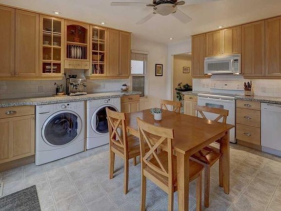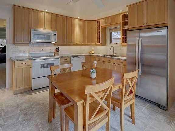 European kitchenGranite counter topsUpgraded appliancesWhite tile backsplashWide patio doorsFilled with lightBuilt-in cabinets