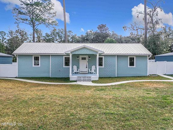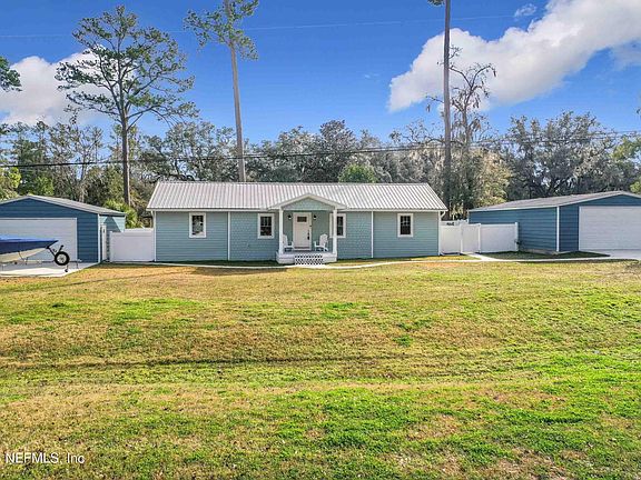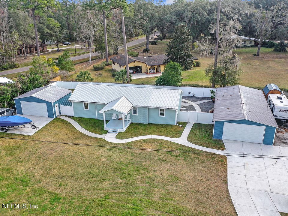 WHY PAY STORAGE FEES? Located in Rudd's 4E Ranch near mile marker #3 of the BALDWIN TRAIL! This Beautifully Remodeled Home on a Half Acre also has Garage Space for up to 6 Cars and several RV's! Perfect for the Car Enthusiast, Business Owner needing Equipment / Supply Storage, or Sports Enthusiasts needing Toy Storage! 80 FT LONG DRIVEWAY! Gym Area behind one of the garages! The Seller is a contractor and you will LOVE this 2BR / 2BA Home with Fabulous Updated Baths and a New Designer Kitchen complete with White Wood Cabinets, Quartz Tops, and Matching Full-Height Backsplash! LVP Flooring throughout with 12 ft Cathedral ceilings at each end of the home! Step outside your back door and immerse yourself in some Tranquil Country Living. Here you will find 2 distinct Fenced Areas that can be customized as needed. This Property is located about 3 miles West of 295, yet it is conveniently close to all Jacksonville has to offer! Hurry and make this property yours before it's Gone!