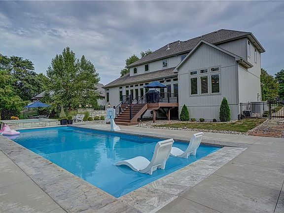 Escape to your own private oasis with this stunning outdoor space, where you will feel like you are on vacation everyday! This private estate sized lot is located in Lee's Summit's coveted 64081 has a 40 foot zero entry salt water fiberglass pool with automatic cover, an 8 person hot tub with its own automatic cover, gas fire pit, extensive landscaping and lighting, along with various levels for entertaining. You can keep your guests outside as they are able to use your own custom pool house, that has an outdoor restroom, wet bar, storage and media entertainment space. The meticulously maintained story and a half home is equipped with many upgrades including: hardwood floors throughout first floor including primary bedroom, energy efficient features such as 2x6 exterior walls, built in home speaker system, irrigation system, plantation shutters, double GE Cafe Smart Ovens, large walk-in pantry and butler's pantry. Second story offers additional living space with bonus loft. Three additional oversized bedroom all include a walk-in closet and connected full bathroom. The extensive basement includes a storm shelter with the studs ready to complete a future finish, stubbed for future bath and wet bar. This custom home provides the ultimate privacy with its tree lined yard and is perfectly located to quickly access shopping, restaurants and highway access in Lee's Summit.