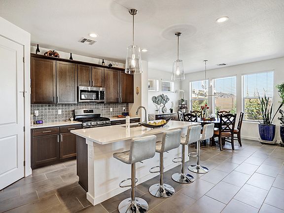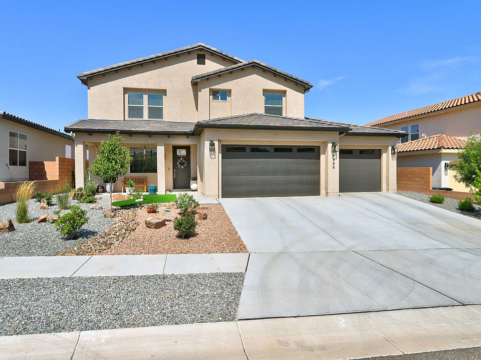 $5K Buyer's Closing Credit! Close to Sandia Labs & AFB, this gorgeous 2023-built home offers 4 bedrooms (1 on main level), 3 baths, versatile loft, and a dedicated office or 5th bedroom on the main level. The open living/dining/kitchen area features a quartz island, gas stove, pantry, and gas fireplace for cozy evenings. Large sliding doors lead to a shaded patio and pergola, perfect for outdoor living. Upstairs, the primary suite boasts a private covered deck to relax amid sunset views, joined by two more bedrooms, a full bath, laundry room, and loft. The spacious three-car garage includes a rear-facing exit door, by new shed. Every detail is thoughtfully curated - from the curb appeal to the lush gardener's backyard retreat - this home hits the mark!