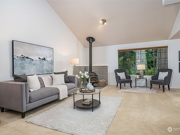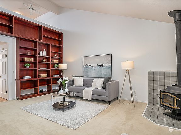 Super spacious townhouse with large rooms & vaulted ceilings in the Lakewood community, right in the heart of the Mill Creek Country Club area; walking trails, pocket parks, golf, tennis, & swim club available. Main floor has huge living room w/ cozy wood stove fireplace & wet bar, 1/2 bath, dining room, large kitchen with pantries and lots of cabinets. Includes a large utility room with extra storage space. Both bedrooms have an ensuite bath upstairs (& both include big walk-in closets), along w/ a loft that makes a perfect home office. Backyard includes private deck overlooking the pond and water feature. Very solid HOA. Close to Mill Creek Town Center; restaurants, shopping, groceries & more. 2-car garage + 2 parking pad spaces as well.