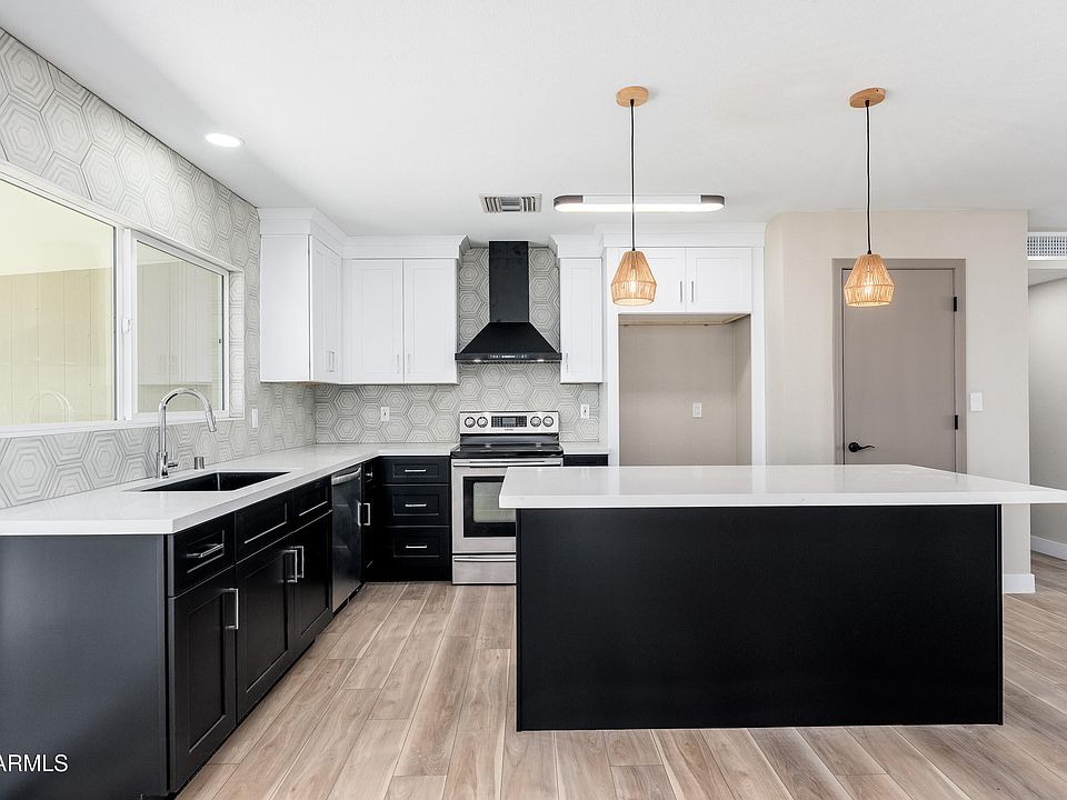 Beautifully remodeled single-story home showcasing high-end finishes and contemporary design throughout. This home features BRAND NEW APPLIANCES, CABINETS, FLOORING AND WINDOWS for a truly move-in-ready experience. The kitchen offers stainless steel appliances, shaker cabinets, quartz countertops, and a breakfast bar. Enjoy vinyl wood flooring and upgraded carpet that create a bright, open flow throughout the home. The bathrooms highlight elegant upgrades including high-end shower systems, custom vanities, framed mirrors, and designer tile niches. The spacious primary suite includes a private retreat or office with French door access to the backyard. Owned solar panels provide energy efficiency and lower utility costs. Outside, relax under the covered patio overlooking a large grassy area