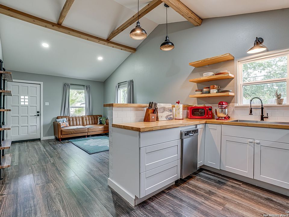 - One Living Area, Eat-in Kitchen, Breakfast Bar, Utility Room Inside, High Ceilings, Open Floorplan, Master Downstairs, Ceiling Fan(s)