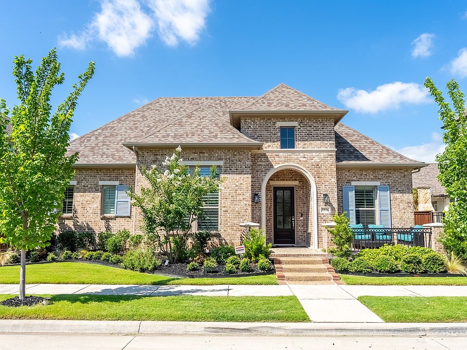The primary suite features vaulted ceilings, neutral tones, and plantation shutters. Its spa-inspired bath includes separate vanities, framed mirrors, a soaking tub framed by dual windows with double shades, an oversized marble-look tiled shower, and a spacious walk-in closet. The fourth bedroom has upgraded hardwood flooring and French doors—ideal as a guest room or office.
