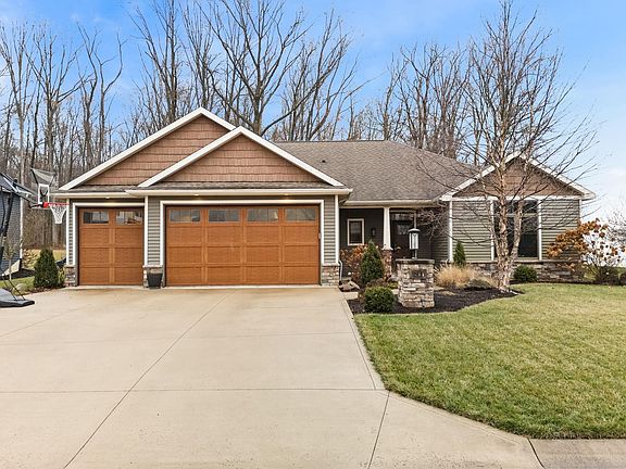 Discover the perfect blend of comfort and luxury in this custom ranch home with luxury features on a beautiful wooded lot. High ceilings and luxury plank floors create an open and inviting space while stained glass accents, custom trim, blinds, and cabinetry add so much charm and character. Kitchen has custom cabinets with pull-out shelves, soft-close drawers, under-mount and floor lighting. All appliances, washer and dryer and freezer in garage stay with the property. The dining room has built-ins and a cozy bay window offering a great view of the wooded backyard. A cozy den with vintage style gas heater in the rear of the home is a great flex space for an office, playroom, sitting room, etc. Primary bedroom is a relaxing retreat with dual sinks and your own cedar lined sauna. Walk-in closet is two levels offering plenty of storage for every season. Second bedroom also has walk-in 2-story closet and all closets have built in storage systems. Off the garage is the laundry room and 1/2 bath with utility sink. Heated 3-car garage features floor drains, 220-power for RV, charging EV car or other equipment, automatic locking garage doors, and ample workspace with workbench and shelves included. A hot water recirculation loop provides instant hot water and water softener stays. In the backyard the stone fire pit with seating area and covered patio with ceiling fan offer plenty of space for entertaining guests and enjoying nature. Tech savvy buyers will appreciate the USB outlets, wired ethernet throughout the home and exterior soffit outlets for ease of putting up Christmas lights and exterior decor. Come take a look at all this special home has to offer!