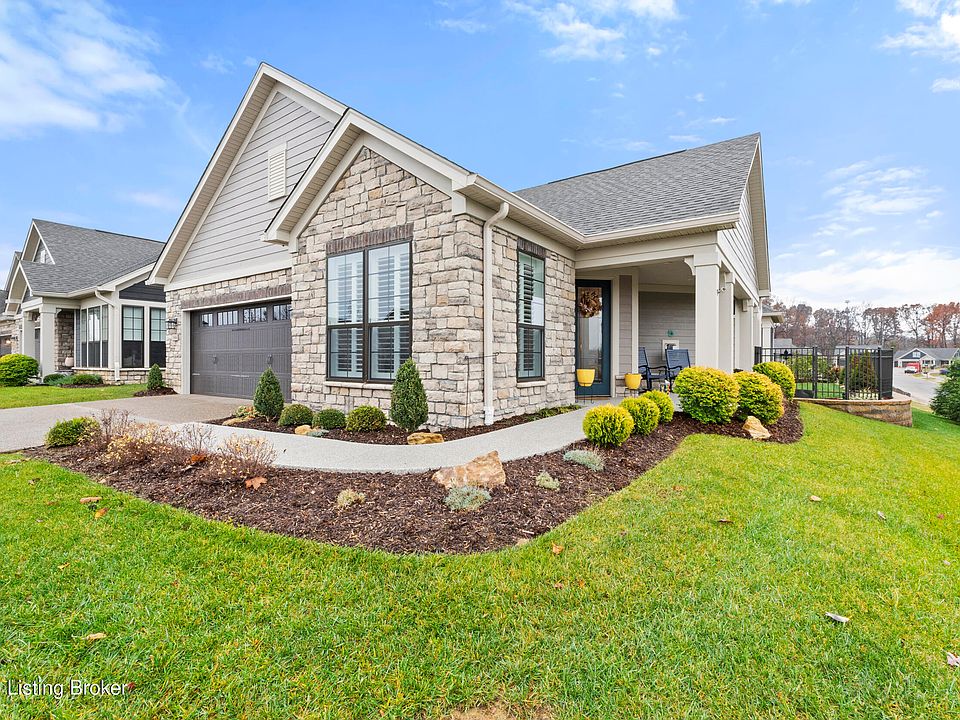 Skip the wait for new construction and step right into refined, easy living! This beautiful 2-bedroom, 2-bath Garden home, built in 2023, offers a sleek, open layout with no steps throughout, making everyday living effortless. Also has an office/flex space if a 3rd bedroom is needed. Beautiful hardwoods throughout. Gas fireplace. Large center island in the kitchen. Enjoy the newly updated back patio along with a wonderful screened-in porch, perfect for relaxing outdoors or entertaining friends without the bugs. Located in one of East Louisville's most desirable Garden Home communities, you'll have access to exceptional amenities, including a sparkling pool, private clubhouse, scenic walking trails, acres of preserved green space, pickleball courts, and a fully equipped exercise room. It's the ideal blend of luxury and tranquility. Hardwood floors throughout. Large center island in the kitchen. Additional perks include all kitchen appliances (plus washer and dryer), over $10,000 in custom blinds, updated landscaping and the privacy of a corner lot.
