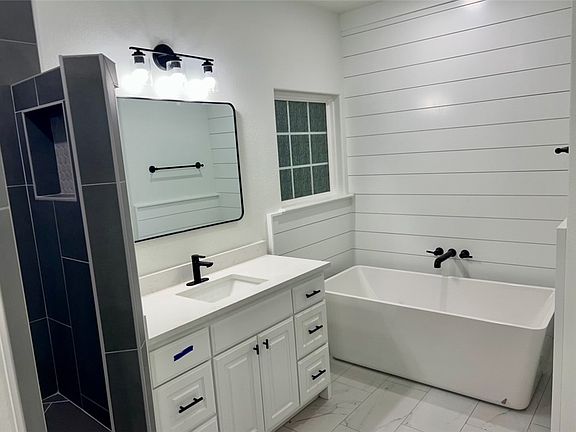 Three car garageFour bdrmLarge uncovered patioCovered patioHigh ceilingsTwo bathFarm sink