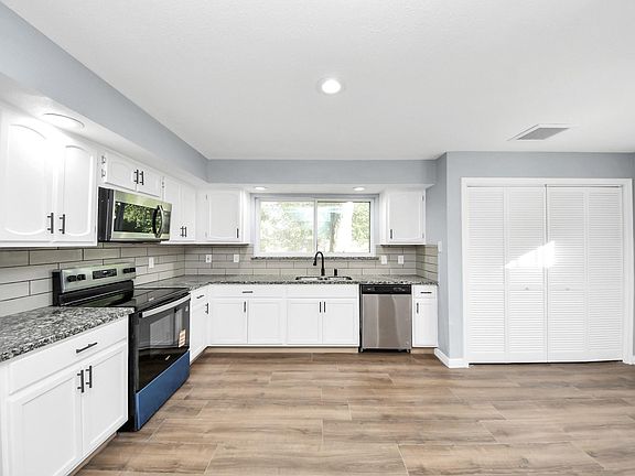Experience refined living in this beautifully remodeled home featuring open, sun-filled living spaces and designer finishes throughout. The spacious family room showcases warm wood-look flooring and a bold black brick fireplace for a modern touch. The gourmet kitchen shines with white cabinetry, granite countertops, subway tile backsplash, and stainless-steel appliances. Bathrooms have been elegantly upgraded with dual vanities, marble-style counters, matte-black fixtures, and custom tile work. Walk-in showers with frameless glass and accent mosaics elevate the spa-like feel, while fresh paint and updated lighting complete the home’s luxurious, move-in-ready appeal.