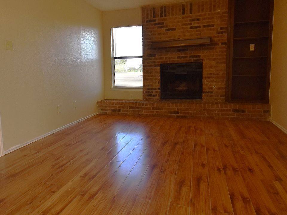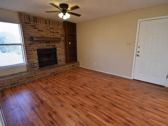 Opens to a nice living room with brick fireplace and built-in shelves.