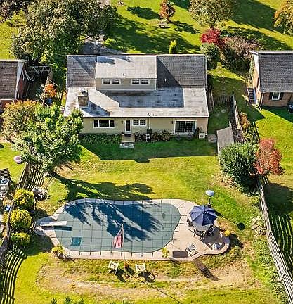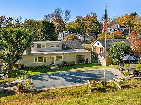 This beautifully updated 3-bedroom, 2-bath home blends timeless character with modern comfort. The inviting Living and Dining Rooms feature gleaming hardwood floors and are centered around a cozy wood-burning fireplace. The redesigned Kitchen is a true highlight, showcasing white cabinetry, granite countertops, a walk-in pantry, and a spacious island—perfect for serving meals or entertaining. The Kitchen opens seamlessly to the Family Room, which offers a second wood-burning fireplace, built-in bookcases, and custom seating benches. A large picture window overlooks the private backyard and sparkling pool area. The newly added Mudroom provides the ideal everyday entry, complete with custom built-in seating and storage benches, a shelved closet, and a pocket door leading to the new Laundry Room. There is a full basement under the original house. It has the plumbing for a half bath that these owners took out but left available. There is plenty of room for work out space/work bench/storage and has a walk out set of stairs. The Primary Bedroom features two double closets and sliding glass doors that open to the backyard. The en-suite Bath includes a granite-topped double vanity and a large glass-enclosed shower. A second Bedroom on the main level has access to a full hall Bath. Upstairs, a spacious third Bedroom doubles as an office or flex space. The fully fenced backyard is an outdoor retreat with a large in-ground pool and diving board. The recently rebuilt retaining wall wraps around the pool deck and patio, creating a beautiful, functional setting for relaxation and entertainment.