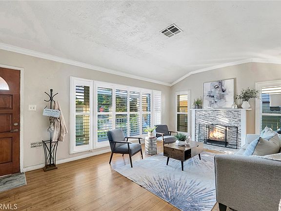 Inside, the living room is drenched in golden Los Angeles sunlight streaming through a commanding window. Angled soffits add architectural flair, and a classic fireplace sets the tone for warm, intimate gatherings. From here, the space flows into a cozy family room—a perfect retreat for movie nights or laid-back conversations.