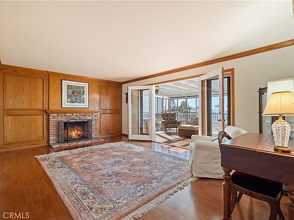Legally a 3-bedroom home, it is currently configured as a 2-bedroom and can be easily converted back. The spacious primary bedroom was created by combining two bedrooms and features ocean views, a cozy fireplace, custom built-ins, crown molding, and two sliding glass doors that open to the front yard and spa area.