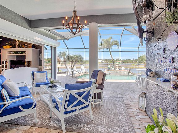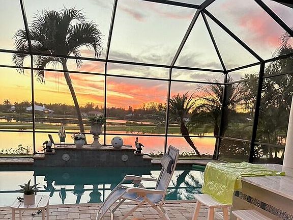 No expense spared for this elegant, meticulously maintained four-bedroom, three-bathroom single-family residence, nestled in the sought-after community of Royal Palm Golf Estates. Boasting a four-car garage and surrounded by lush, exquisite landscaping, this home offers an unparalleled outdoor living experience. The expansive area overlooks breathtaking 180° panoramic lake views on the golf course, featuring a summer kitchen and pocketing sliding doors that seamlessly blend indoor and outdoor spaces. Inside, the home is a sanctuary of space and light, with a layout that includes a family room, living room, dedicated dining room, and a cozy breakfast nook. A charming gas fireplace, visible from the kitchen, adds warmth and ambiance. The newly updated kitchen is a culinary haven, with solid white quartz countertops, high-end appliances, including a gas cooktop, double wall oven, oversized refrigerator, two pantries and dual dishwashers, making it a chef's dream. Spacious bedrooms offer tranquil retreats, while the spa-like master bathroom, complete with a separate garden tub, provides a luxurious escape. Spacious outdoor, expanded lanai provides plenty of room for entertaining which includes the outdoor bar/grill station, tranquil golf course and water views, pavers, outdoor shower, and pool bath. This home offers so many upgrades with quality attention to detail that you can easily make this masterpiece home your forever home in paradise including, but not limited to, the 4 car garage with a mini-split A/C system and golf cart side entrance, buried 500 gallon gas tank, tankless hot water heater, audio/visual camera system around property, desirable open floor plan, stunning views, and storm protection for all windows and coverings. Royal Palm Golf Estates is renowned for its exceptionally low HOA fees of just $327 per quarter, with the option to join the Royal Palm Golf Club for those who wish. The residence is further enhanced by a heated pool, along with impact-resistant doors and windows, ensuring peace of mind and comfort. This home is not just a living space but a lifestyle choice for those seeking luxury, privacy, and community.