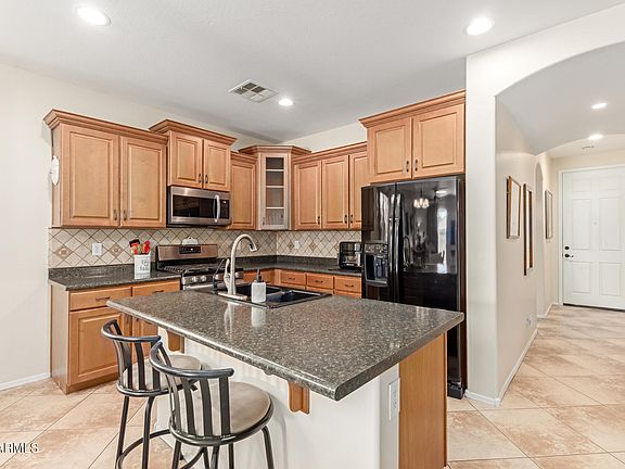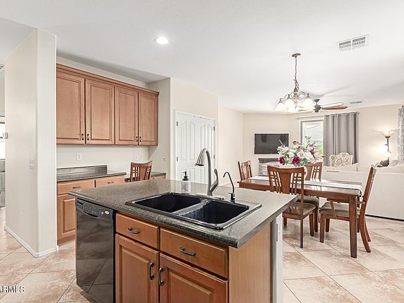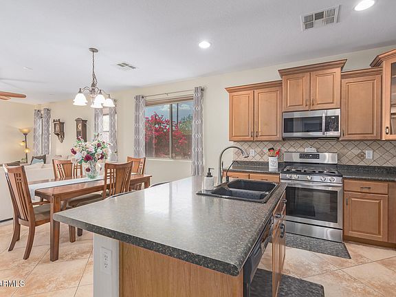 Pride of ownership shines on this upgraded 4 bedroom, 3 bathroom, PLUS a bonus/teen room/den, with mountain views, and RV GATE! Spacious open kitchen with GAS STOVE, tile backsplash, ISLAND & BREAKFAST BAR, & upgraded cabinets. Double door entry into the spacious primary suite and bathroom with WALK-IN CLOSET, separate shower & bathtub, and dual sinks. Desirable layout with spacious bedrooms, Jack n Jill bathroom, and separate area perfect for a man cave, craft room, toy room, or home office. Upgraded lights/fans/fixtures, diagonal lay tile, tall ceilings, pre-wire surround sound inside and on patio. Enjoy the weather underneath your covered patio in your low maintenance tropical paradise with a small grass area perfect for kids & dogs. EPOXY GARAGE FLOORS. 1.5 year old exterior paint!