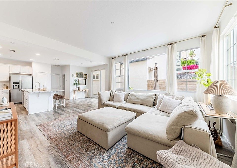 The bright and airy living room seamlessly flows into the modern kitchen, creating the perfect setting for entertaining or family gatherings. Sliding doors open to your private patio/yard area—ideal for relaxing or hosting weekend BBQs.