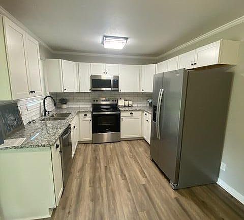 Beautifully updated 3 bd 2 ba home on a Cul-de-Sac. All new flooring; carpet and LVP. Freshly painted walls and trim. New lighting and fixtures. New kitchen cabinets. New granite counters. All new stainless steel appliances including; flat cooktop stove, dishwasher, built-in microwave and refrigerator. Both bathrooms have been completed renovated as well. Both have new bathtubs, vanities and flooring. AND outside, this home has a big covered front and back porch, plus a large, covered carport. Out back is a storage building ready to keep your lawn mower and tools out of the rain. Come take a look!