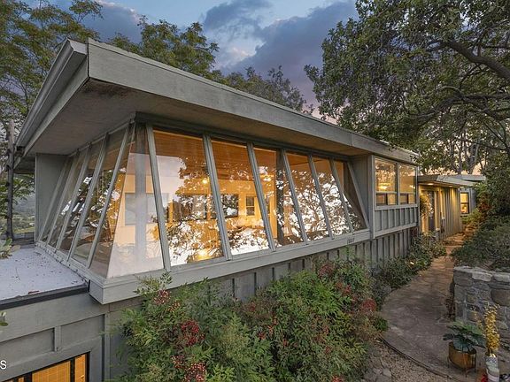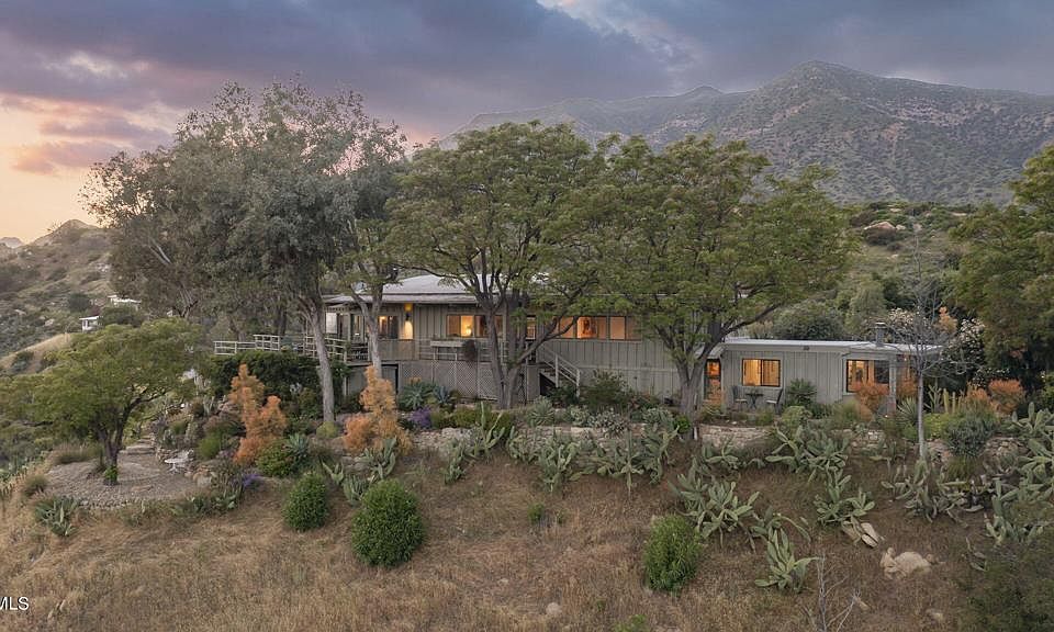 Built in 1974 (est.) by acclaimed artist and Walt Disney's most well known Production Designer, Frank Armitage (Sleeping Beauty & The Jungle Book). This Shangri-La retreat home sits on almost 10 acres with unobstructed views from multiple decks overlooking the entire Ojai Valley, portions of the upper valley and the Topa Topa mountains. Enjoy your own hiking trails and watch the pink sunsets on the Topa Topas. The main house has 2 primaries (the 2nd might also work as a large entertaining room). There is an artists room (the light is amazing) with 90 degree views of the Topa Topas and the Ojai Valley . The primary bedroom sits next to the living room and has views of the valley and a peak of Lake Casitas. The second primary bedroom is located a few feet below the artists room. The home also has a mural created by Frank Armitage, reminiscent of his time spent working with Mexican Artist Sisqoeiros. There are also two cottages on the property. One of the units was built with local riverstones and the second used to be a music studio with a full bath and kitchen (studio). As you drive down the private road through avocado and orange orchards, you are welcomed by the neighbors' ducks, sheep, goats, chickens and the occasional farm animal. Do not forget to say hi to Sweet Lillie the local Anatolian Sheepdog who lives nearby and protects the farm animals. There are amazing boulders and rolling hills all over the property. There are very few neighbors down this private road. You can even walk to your neighbors tasting room at the Ojai Olive Oil Co. Truly hard to imagine until you have experienced this amazing zen-like property. Wonderful opportunity to have as a home or turn it into an artist's retreat.