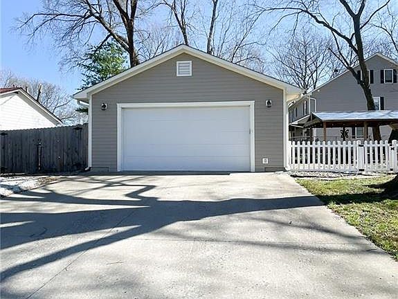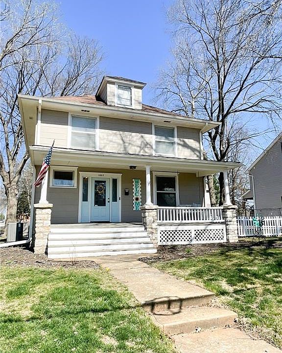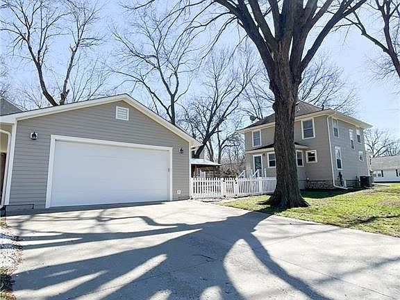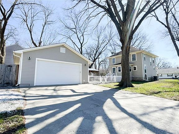 Welcome to your charming vintage home in the heart of Blue Springs! This stunning two-story home, built in 1910, exudes character and timeless elegance. With the esteemed Thomas J Ultican Elementary School in walking distance, it's perfect for families looking to be close to school. Step onto the inviting front porch adorned with a classic porch swing, beckoning you to unwind and soak in the neighborhood ambiance. Entertain with ease in the spacious fenced yard featuring a pergola area that is perfect for outdoor entertaining and barbeques. A large detached garage is the perfect space for not only your vehicles but would be a great workshop as well! It doesn't end there, it also features a shed, barbecue pit area, and a white picket-fenced yard! The inside is where modern and vintage collide with beautiful wood floors, columns when you walk through the door, grandiose staircase that you can access from the entryway or kitchen, but with modern colors and updated kitchen and bathroom areas! Don't miss out on this one-of-a-kind beauty!