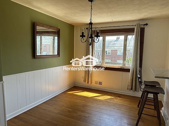 It is a classic center rowhouse with a big bay window in the living room. Many of the rooms are painted with different colors giving it a homey feel. This home has been well maintained and very gently lived in. The living room is a neutral white with hardwood floors. Move to the dining room with wainscotting to the chair rail, a preet green accent wall, a modern chandelier, another bay window and a breakfast bar open to the kitchen. The kitchen has tasteful blue cabinets, granite countertops, modern black and stainless steel appliances, and a programmable refrigerator with a touch screen. Exit through the kitchen door to a wide balcony overlooking the yard. Downstairs there is a finished family room, full bath with a shower, office area and a several laundry room. You can walk out to the yard from here. The top floor offers the usual 3 bedrooms. THe smallest and midsized are in the back and the master and update bath are in the front. Zoned for Oakleigh ES, Pine Grove MS, and Loch Raven HS. Fees include Monthly rent of $2150, Security Deposit of $2150, Residential Benefits Package $25/month, and, if applicable, pet rent of $30/month per pet, Available Now!