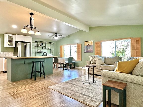 This light and bright home features vaulted ceilings, an open floor plan, custom kitchen with soft-close cabinets, stainless steel appliances, recessed lighting, and newer flooring. Bathrooms have been newly renovated, and the home includes a new A/C, updated plumbing, double-pane windows, and fresh exterior paint with new roof.